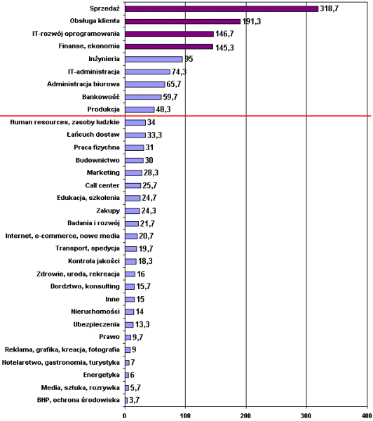 W dalszej części opracowania analizowane były oferty dostępne w portalu pracuj.pl w grudniu 2013 r. W tym miesiącu najwięcej ofert pracy przypadało na branże: „sprzedaż”, „obsługa klienta”, „finanse, ekonomia”. Nazwy branż odpowiadają terminologii przyjętej w portalu.